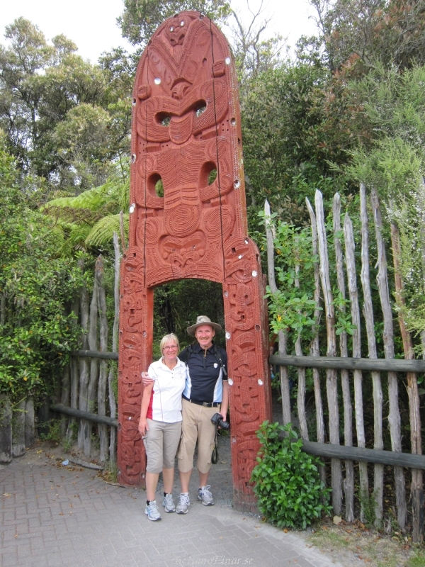 En snäll turist tog kort på oss vid ingången till byn. När det var dags att ta sig tillbaka kände vi att det promenerats tillräckligt för idag, så det blev buss. Inne i stan hittade vi ett litet mathak som hade färsk hoki. Den smakade otroligt bra, nersköljt med rätt sorts dryck… När vi kom till campingen kollade vi med google-maps och såg att vi gått drygt 10km för att komma till Te Puia. Avslutade dagen med att bada i poolen med varmt mineralrikt vatten. Det var riktigt skönt. Vi följde inte den blå färdvägen utan gick utefter vattnet på utsidan av golfbanan.