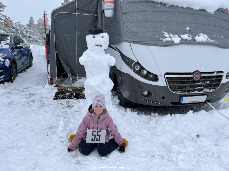 Blev några timmars utförsåkning nästa dag, och efter lunch började vi plocka ner förtältet. Man ser på snögubben framför husbilen att det töat rejält.